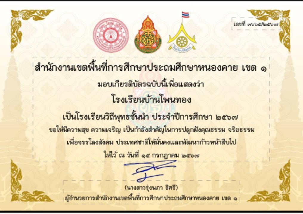 โรงเรียนบ้านโพนทองผ่านการประเมิน โรงเรียนวิถีพุทธชั้นนำ ประจำปีการศึกษา 2567 ระดับเขตพื้นการศึกษาประถมศึกษาหนองคาย เขต 1