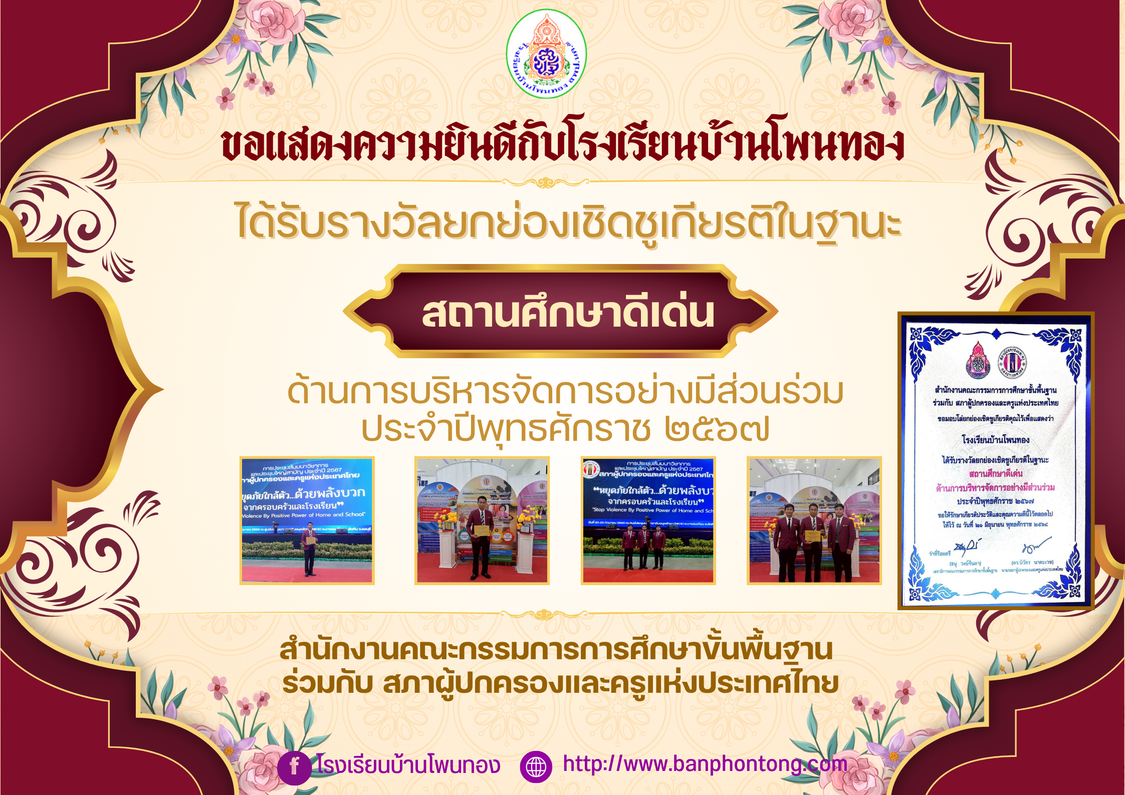 โรงเรียนบ้านโพนทองได้รับรางวัลยกย่องเชิดชูเกียรติในฐานะ สถานศึกษาดีเด่น ด้านการบริหารจัดการอย่างมีส่วนร่วม ประจำปีพุทธศักราช 2567